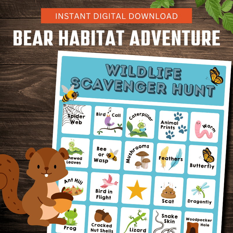 Print one per child or team. As they walk, kids can mark off signs of wildlife they spot — like feathers, nests, chewed leaves, ant hills, or even the sound of birdsong! The bingo-style layout encourages them to find items in a row, column, or diagonal, turning it into a game-style scavenger hunt that’s both educational and exciting. Go for a full blackout if you want an extra challenge!
